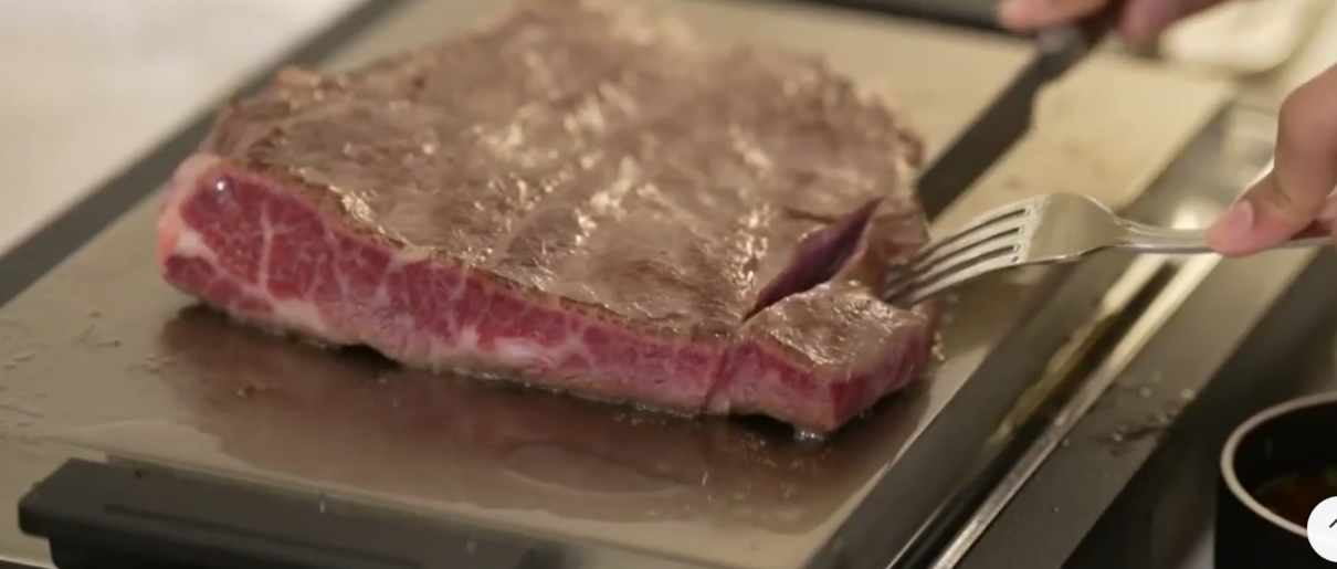고기의 맛을 극대화시켜준 또 하나의 비결은 바로 전기 플레이트, ‘발뮤다 더 플레이트 프로’입니다. 일반 가정에서도 고급 스테이크 하우스급 조리를 가능하게 해주는 이 제품은, 현재 셰프들 사이에서도 높은 평가를 받고 있습니다.